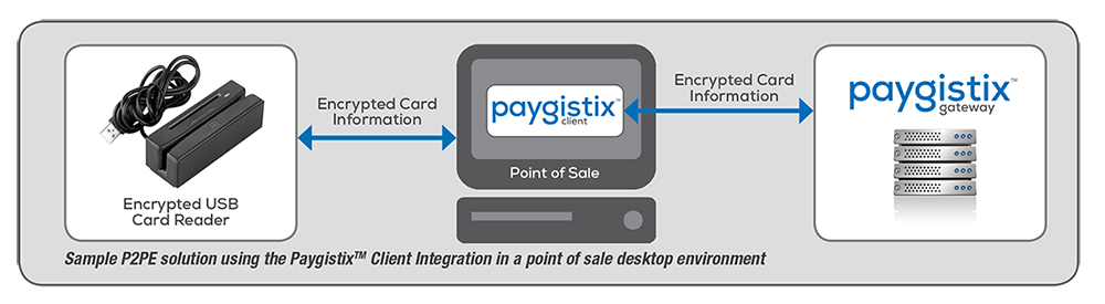 Our point-to-point encryption (P2PE) solution encrypts sensitive cardholder data at the hardware layer from card swipe until it reaches the Paygistix payment gateway. By utilizing P2PE technology, cardholder data no longer traverses the merchant’s environment in plain text, thus adding a layer of protection by rendering stolen cardholder data unreadable by a third party.